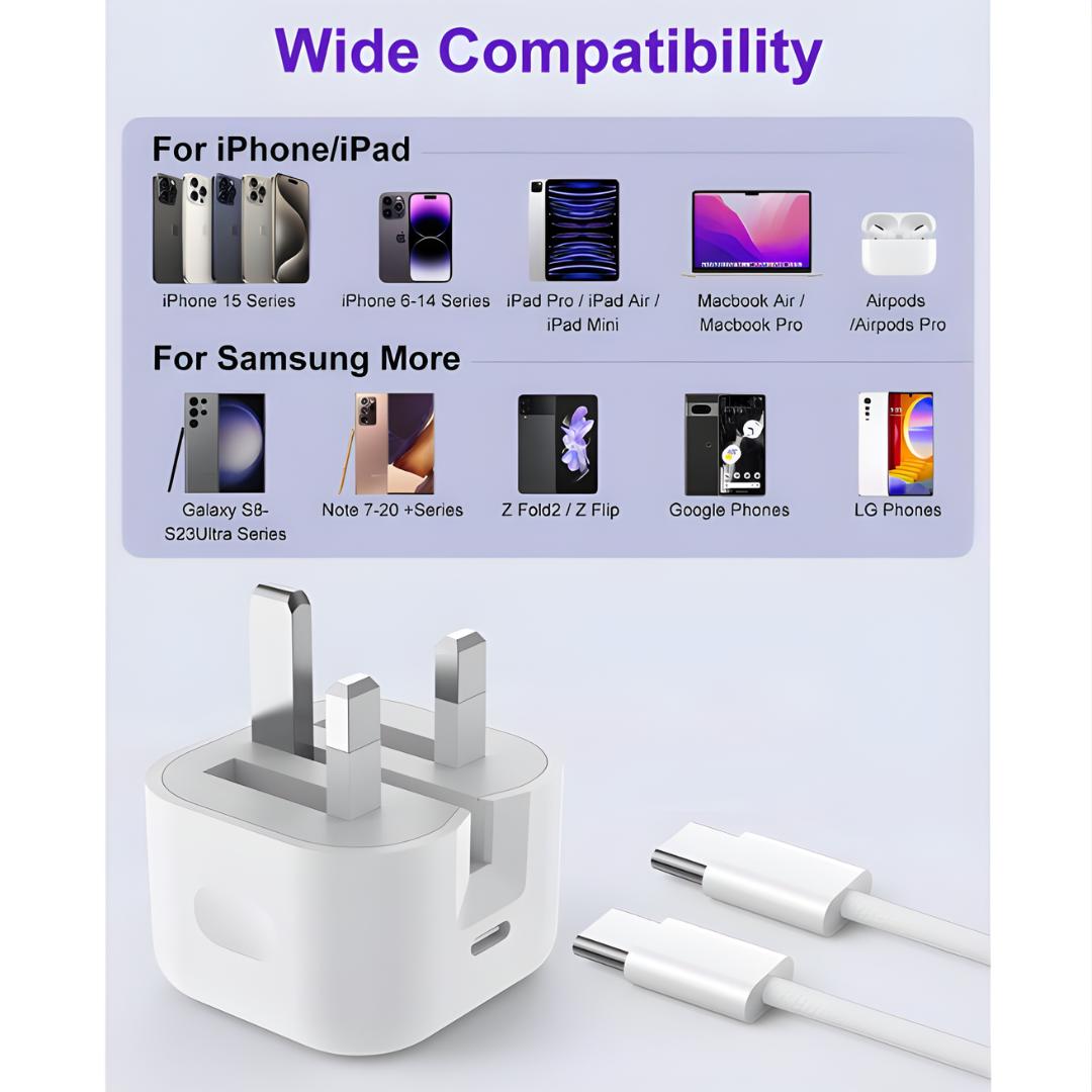 Power your latest Apple and USB-C devices with this high-quality 20W USB-C fast charger and premium braided Type-C to Type-C cable. Designed specifically for modern USB-C iPhones and iPads, it delivers reliable fast charging with full safety protection in a compact, travel-ready design.