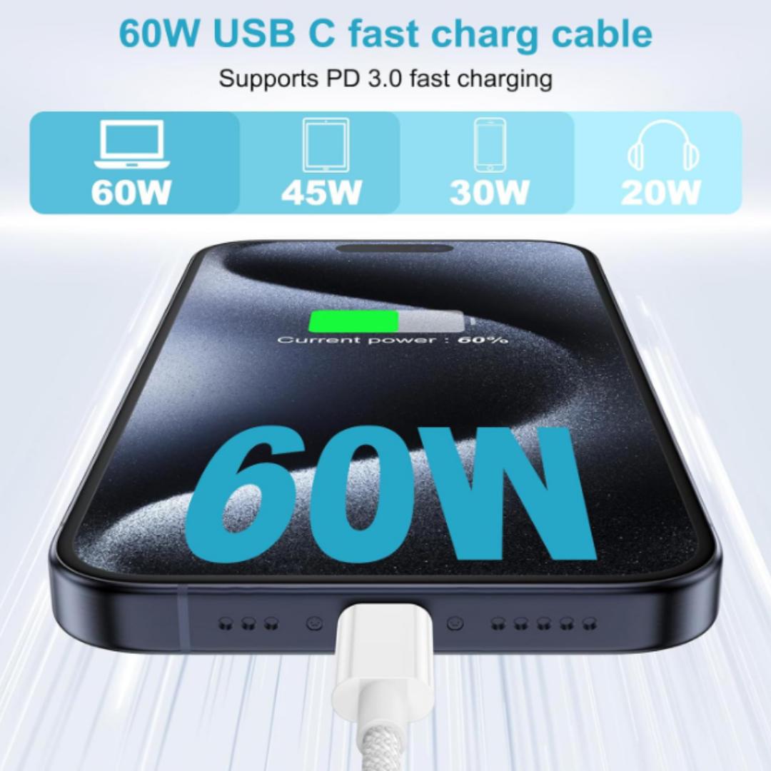 USB-C to USB-C Charger Cable 3M – 60W / 100W Fast Charging (For iPhone 15/16/17, iPad, Samsung, Android, USB-C Devices) Smartphone